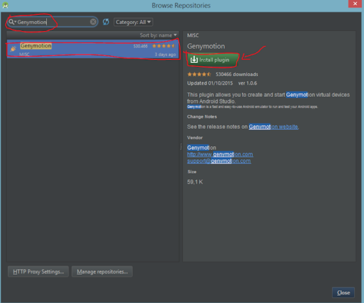 Các bạn gõ Genymotion vào ô tìm kiếm, sẽ thấy nó hiện ra plugin của Genymotion ở phía dưới. Sau đó các bạn click và nút ở Install plugin ở bên cạnh, hộp thoại xác nhận hiện ra thì chọn Yes để Android Studio tiến hành tải và cài đặt plugin: